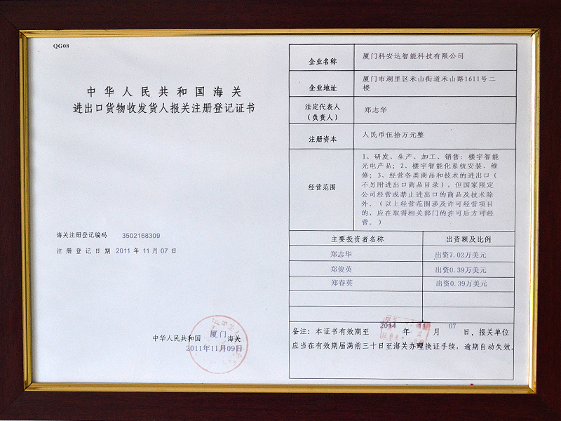 廈門科安達(dá)智能科技有限公司,是一家擁有完全自主開發(fā)能力和生產(chǎn)能力的知名高新技術(shù)企業(yè)。“KAD”是科安達(dá)公司在國內(nèi)注冊的全球性品牌,公司已經(jīng)通過ISO9001:2008國際質(zhì)量體系認(rèn)證和3C等強(qiáng)制性認(rèn)證,并成為國內(nèi)外很多知名安防產(chǎn)品的核心合作伙伴 詳情>>